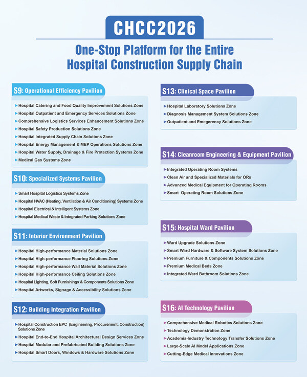 Dengan format menarik berbasiskan studi kasus, CHCC 2026 terdiri atas delapan paviliun pameran tematik, mencakup efisiensi operasional, inovasi sistem medis khusus, sistem bangunan terintegrasi, lingkungan interior, peningkatan ruang klinis, rekayasa ruang bersih, bangsal rumah sakit, serta teknologi akal imitasi (AI). CHCC 2026 menghadirkan 40 zona pameran yang mencakup seluruh proses pengadaan konstruksi rumah sakit—mulai dari perencanaan dan desain, sistem mekanikal dan elektrikal, penyelesaian interior, rekayasa medis khusus, peralatan medis, robot medis, aktivitas operasional rumah sakit berbasiskan teknologi digital, hingga manajemen logistik dan operasional. Secara keseluruhan, ribuan solusi terintegrasi dan siap diterapkan akan tampil di CHCC 2026 untuk membangun masa depan infrastruktur layanan kesehatan modern.